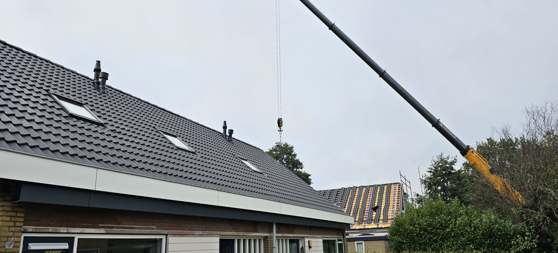 Het dak is voorzien van nieuwe folie en latten. Er zijn nieuwe pannen gelegd, nieuwe dakramen geplaatst, nieuw zink in de goten aangebracht. We hebben de bestaande dakkapellen vervangen voor nieuwe onderhoudsarme dakkapellen. Het aftimmeren van de dakkapellen aan de binnenzijde is verzorgd door Hoekstra en Westra Totaalbouw b.v. Tevens is het dak klaar gemaakt voor het aanbrengen van de zonnepanelen. De betimmeringen aan de buitenzijde zijn duurzaam uitgevoerd met onderhoudsvrije rockpanel.